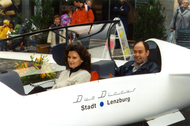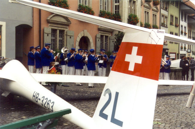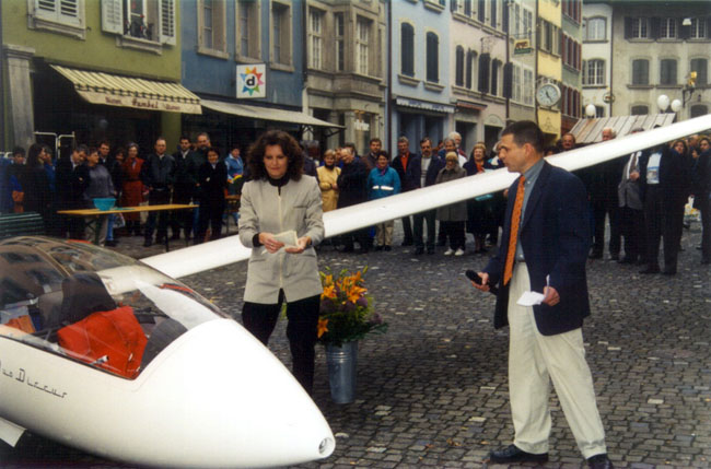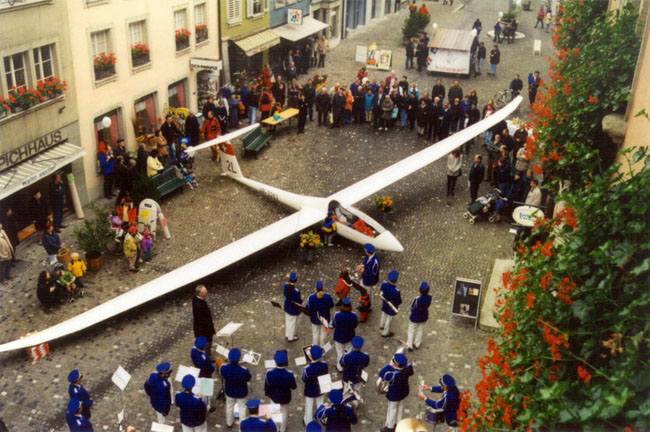 Es war ein ziemlich ungewohnter Anblick, den die Lenzburger Rathausgasse am 31. Oktober 1998 bot. Unser Duo Discus streckte seine Flügel behutsam zwischen den engen Häuserreihen. Rundherum interessierte Passanten und natürlich zahlreiche Mitglieder der SGL, die dem festlichen Taufakt beiwohnten. Matthias Jauslin erinnerte in seiner Festrede an die Anfänge der SGL, als man noch von den nahen Hügeln der Stadt zu kurzen Gleitflügen startete. Stadtrat M. Werder hiess die Segelflieger in ihrer Heimat herzlich willkommen. Er brachte deutlich zum Ausdruck, dass man es seitens der Stadt Lenzburg sehr schätze, dass die SGL als traditionsreicher Lenzburger Verein, sich ihrer Ursprünge erinnere und zur Taufe ihres modernsten Flugzeuges hier nach Lenzburg komme. Er freute sich, dass der Name der Stadt Lenzburg auch in Zukunft auf lautlosen Schwingen in die Welt getragen wird. |