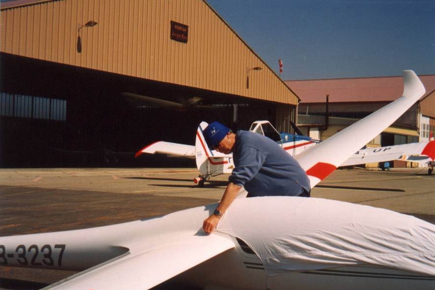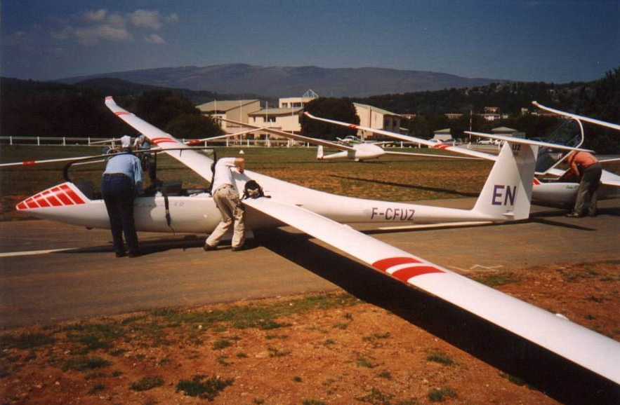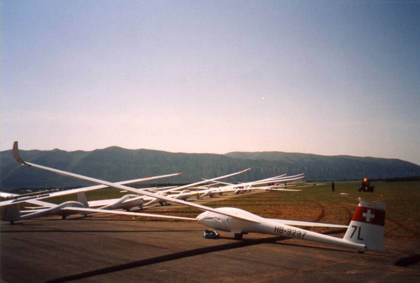 Der Flugbetrieb gestaltete sich für uns wie im Schlaraffenland. Gegen 5 Euro pro Nacht konnten wir unsere 7L am Morgen einfach aus dem Hangar ziehen und so Zeit, Kräfte und Flugzeug schonen. Zwar war der Platz voll ausgelastet mit allerhand Kursen, von "stage féminin" bis zum Kunstflugtraining der équipe de France, aber fast alles spielte sich auf der Ostseite ab, und wir mussten die Startbahn der Westseite nur mit etwa 10 andern Piloten teilen. So wurde die Warteschlange nie lang. Zudem waren genügend Schleppflugzeuge im Einsatz. Matthieu kümmerte sich um alles. Schon am Montagmorgen beim ersten Montieren kam er vorbeischauen. Seine Nimbus 4D, für uns die bestbekannte EN, stellte er jeweils schon früh zuvorderst in die Reihe, um als Erster starten zu können. Damit nicht genug: Ab dem 2. Tag gab er Befehl, seine Gruppenleute sofort hinter ihm starten zu lassen. Zu diesem Zweck parkierten wir unsere Segler gleich neben dem Nimbus im Gras und installierten uns fertig. Nach dem Start des Chefs packten kräftige Hände zu, schoben uns einen nach dem andern vor die übrigen Wartenden auf die Asphaltpiste. Seil ein, und los gings! Das Hochgefühl wurde noch grösser, als an Freitag Eric Napoléon, persönlich mit seiner majestätischen Statur am Start anwesend, uns "petits Suisses" das Capot zudrückte, den Flügel hielt und abgab.