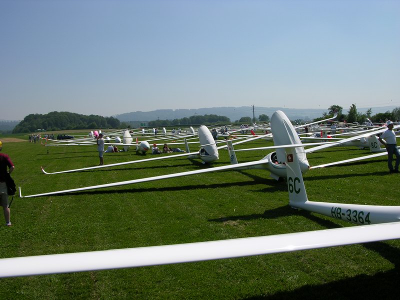 Der sechste Wertungstag war dann reines Lustfliegen. Am Vortag hatte es geregnet. Heute war eine klassische Rückseitenlage - noch ziemlich feucht und labil. Die Konkurrenzleitung entschied sich für eine kurze Sprintaufgabe: St-Imier und zurück, 191,1km. Ich glaube, wir freuten uns alle auf diesen kurzen, schnellen Flug, denn die letzten Tage hatten stark an unseren Kräften und Nerven gezehrt. Die Aufgabe hielt was sie versprach: wir erfüllten die Aufgabe in weniger als zwei Stunden. Meine Durchschnittsgeschwindigkeit lag bei 109,7km/h, nur wenig langsamer als der Tagessieger. Bei einer so kurzen und schnellen Wertung zählt jeder Kreis. In einem einzigen schwachen Aufwind verliert man mehrere Minuten, die man später nie mehr aufholen kann. Alles musste bei diesem Flug passen, wenn man schnell sein wollte. Bei mir passte fast alles: bloss an der Wende in St-Imier und kurz danach, musste ich einen schwächeren Aufwind annehmen, sonst fand ich immer eine gute Linie und konnte viel geradeaus fliegen. Mein Kreisanteil lag bei nur 19%. Das heisst, von 104,5 Minuten Flugzeit verbrachte ich bloss knapp 20 Minuten mit Kreisen. So ein Flugstil macht natürlich Spass und alle Piloten waren am Abend zufrieden und freuten sich auf den nächsten und letzten Wertungstag.
