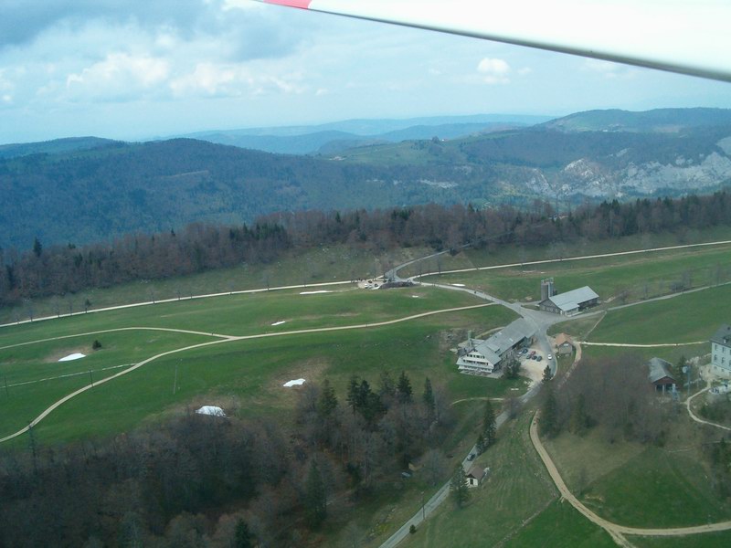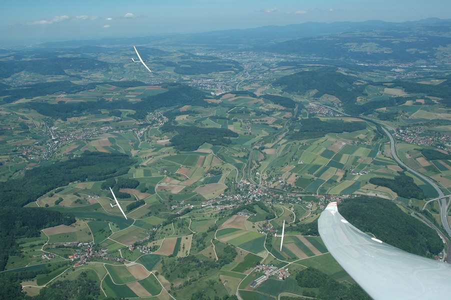 Hier war der eigentliche Knackpunkt der Aufgabe: es war inzwischen bereits 17 Uhr und die Luft über den Freibergen war müde geworden. Ich geriet immer tiefer, und es wurde verdächtig ruhig um mich herum. Das Plateau ist dort 1000m hoch und mir war klar, dass ich in nur 1400m Höhe kurz vor Saignelégier nicht mehr viel Spielraum hatte. Ich spähte angestrengt nach einem Zeichen für Aufwind. Die Sonne stand nicht mehr hoch, das Doubstal lag im tiefen Schatten und die trockenen Wiesen der Freiberge schienen einfach nichts mehr hergeben zu wollen. Da entdeckte ich genau vor mir eine dünne weisse Trübung am stahlblauen Himmel. Es war die Kondense eines Aufwinds, der vom Etang de Gruère aufstieg. Abendthermik!, fuhr es mir durch den Kopf, und Abendthermik findet man über Feuchtgebieten. Ich wurde mit guten 2m/s Steigen belohnt. Wenig später machte ich mich aus über 2000m auf den Heimweg. Um 17.50 Uhr erwischte ich an der Lebern nochmals 1,6 m/s Steigen bis auf 2000m. Zwanzig Minuten später war ich als Erster zuhause.