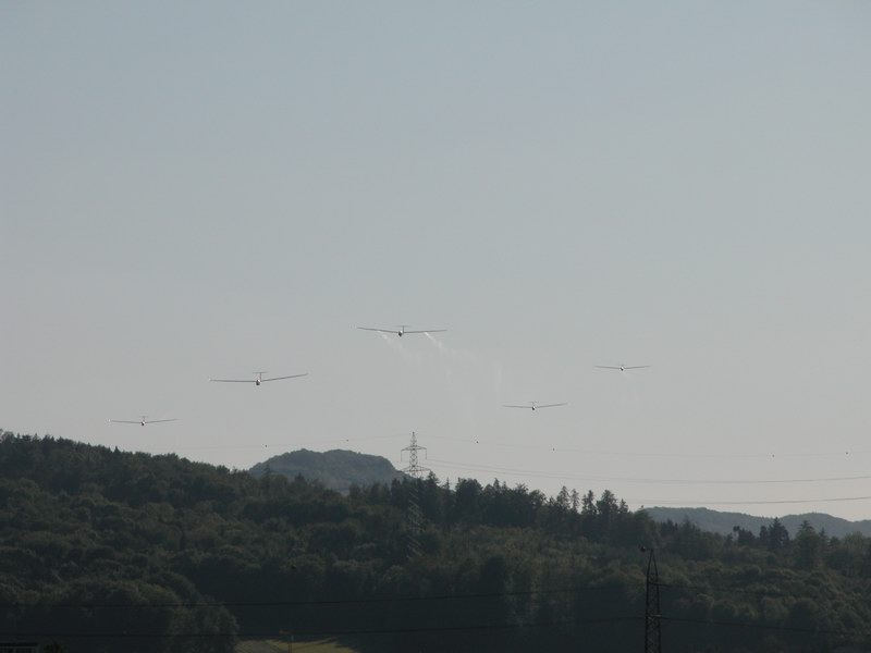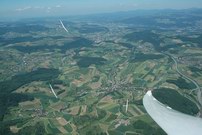 Frust gab es für mich vor allem an den Tagen 4 und 5. Am vierten Tag ging es ja eigentlich noch: zunächst war ich schnell unterwegs und alles schien zu passen. Die Aufwinde waren genau dort, wo ich sie erwartete und ich stieg besser als meine Konkurrenten. Dann liess ich einen entscheidenden Aufwind aus und das Blatt wendete sich mit einem Schlag. Der Pulk, der bis dahin noch hinter mir lag, war plötzlich oben an mir. Ich machte den Fehler mich von nun an am Pulk zu orientieren, anstatt mich auf meinen eigenen Flugweg zu konzentrieren und geriet zwangsläufig immer mehr ins Hintertreffen. Und ausgerechnet am äussersten Punkt der Aufgabe (in der Nähe von Schelklingen) kam ich tief und musste mich in einem halben Meter Steigen wieder hochkämpfen, währenddessen meine Konkurrenz hoch über mir wendete und heimflog. Am Abend hatte ich eine gute halbe Stunde auf die Besten verloren.